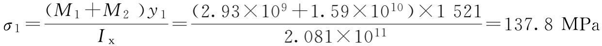 主梁惯性矩:Ix=2.081×1011mm4;y1=1521mm;y2=1273mm;Iy=6.05×1010mm4;x1=820mm;x2=708mm;弹性模量E=2.1×108MPa。